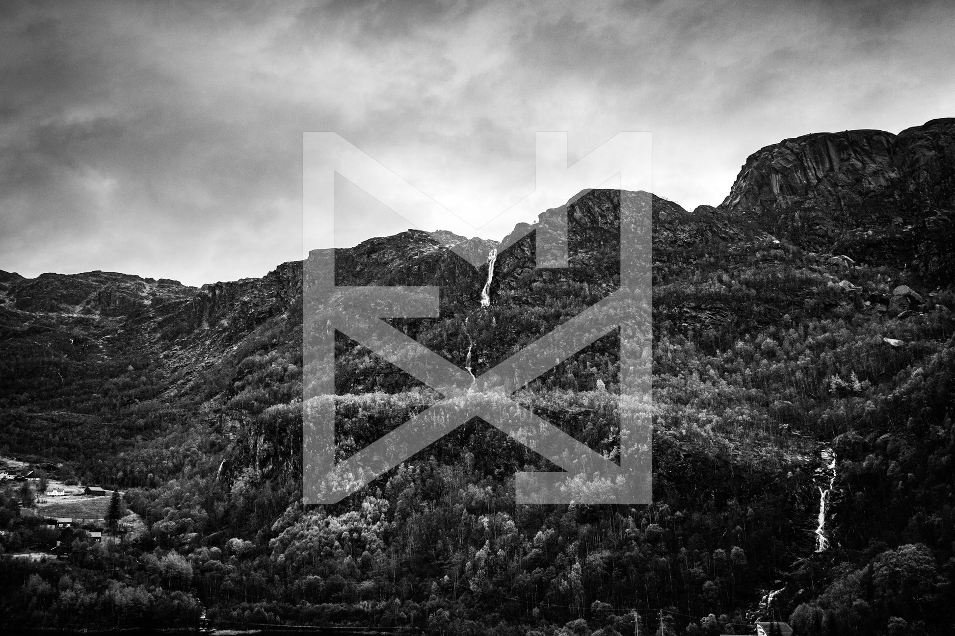 A black and white print of waterfalls surrounding Hårlandsnepane in Etne, Norway.