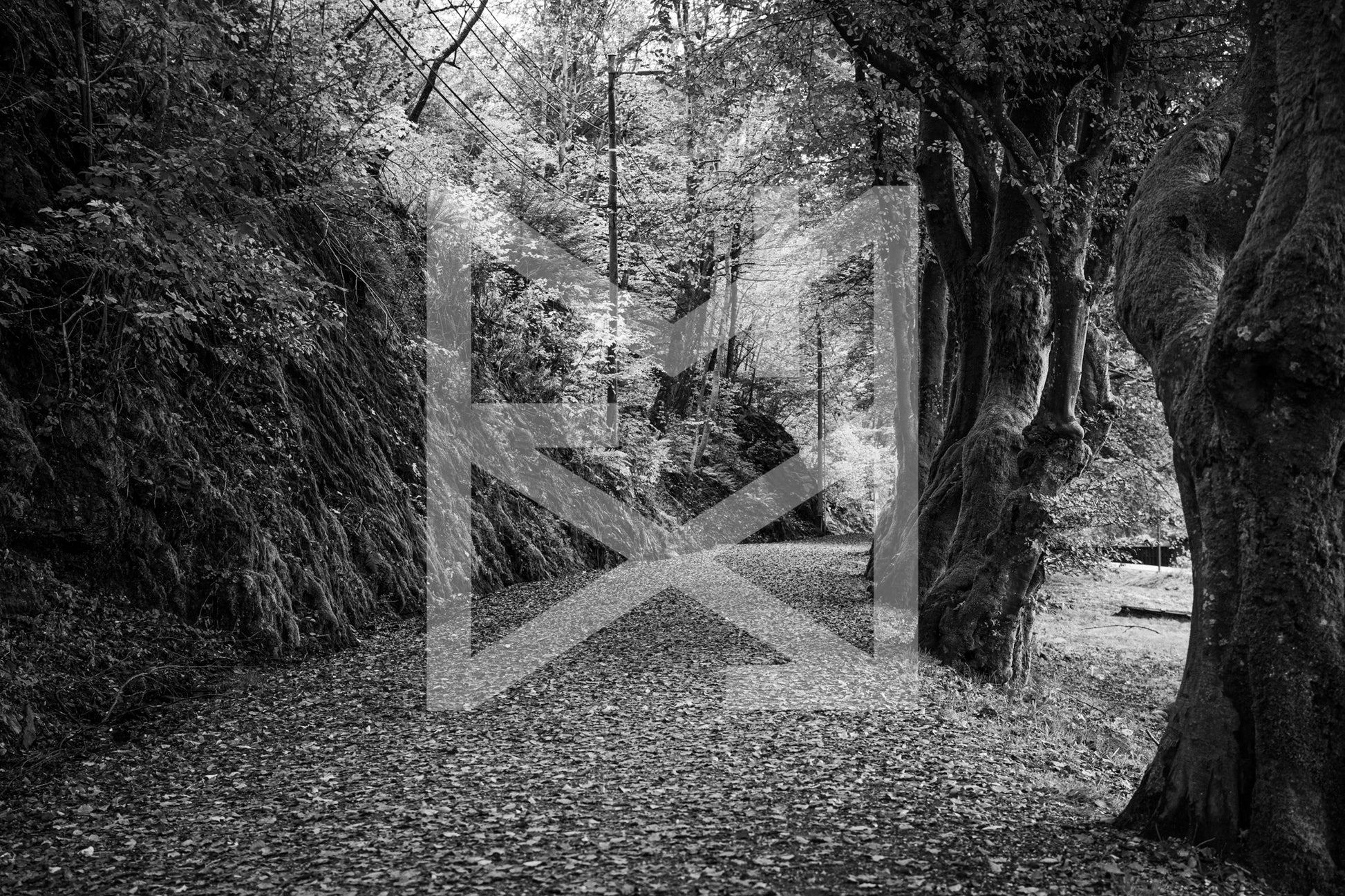 A black and white print of a walking path covered in freshly fallen autumn leaves in Bergen, Norway.