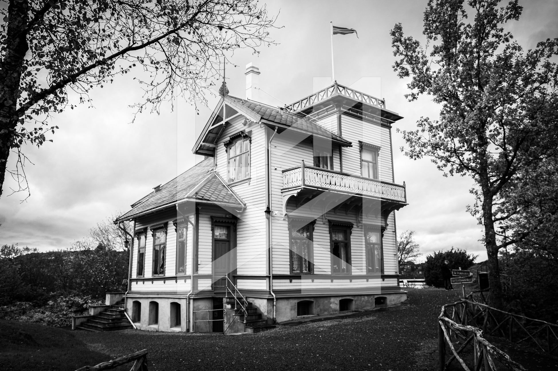 A black and white print of Edvard Grieg's home, Troldhaugen, in Bergen, Norway.
